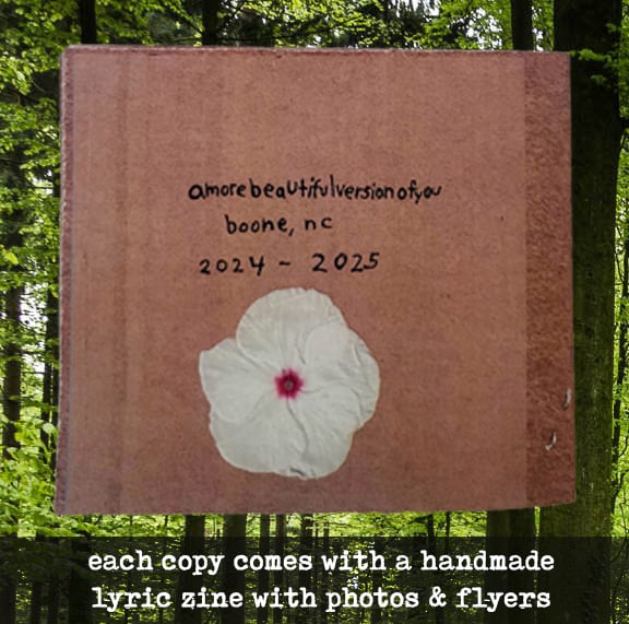 cds for amorebeautifulversionofyou. cd includes all of their recorded material and each copy comes with a handmade lyric zine with photos of the band and flyers of shows they played during their brief, but incredible, time together.
